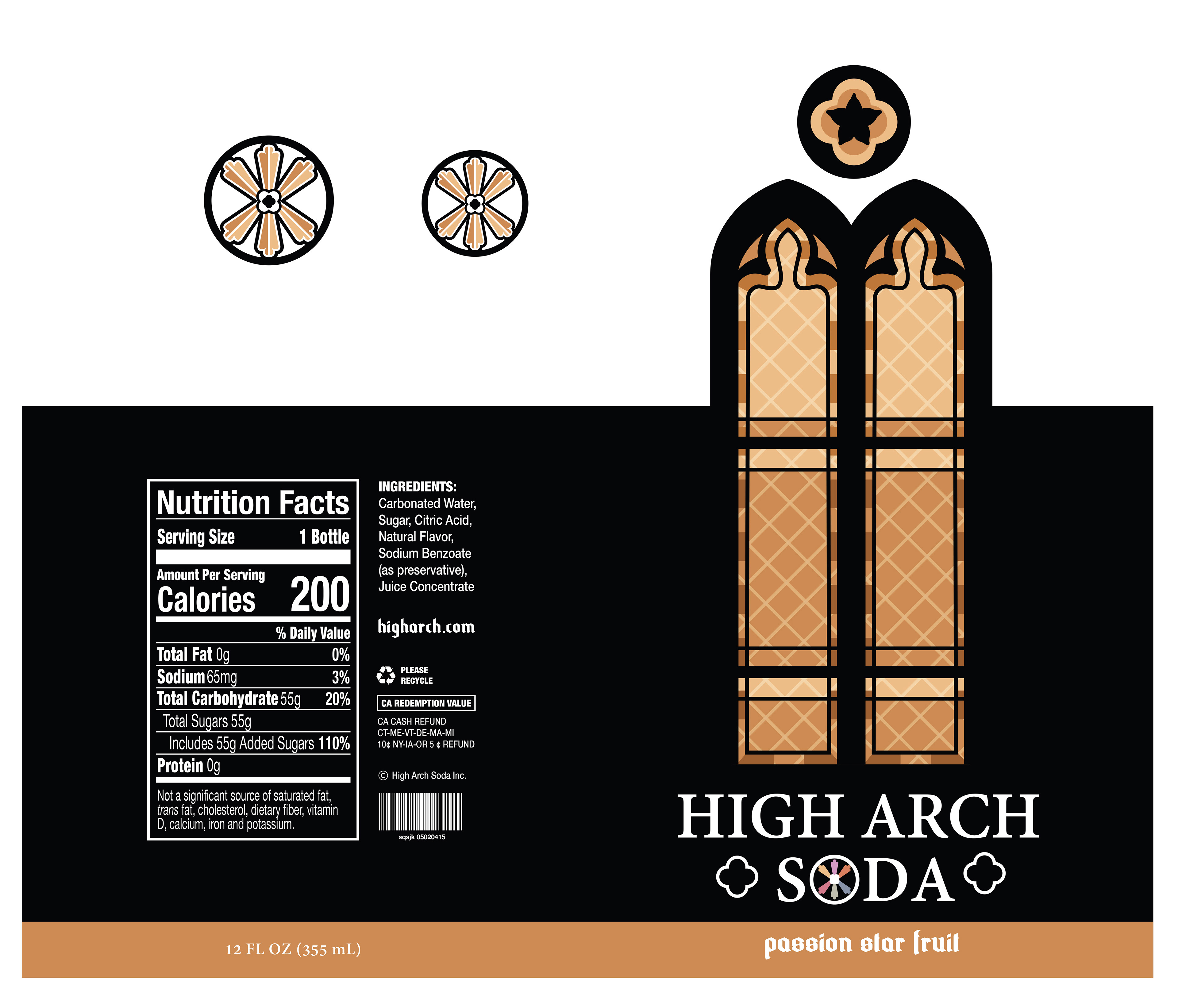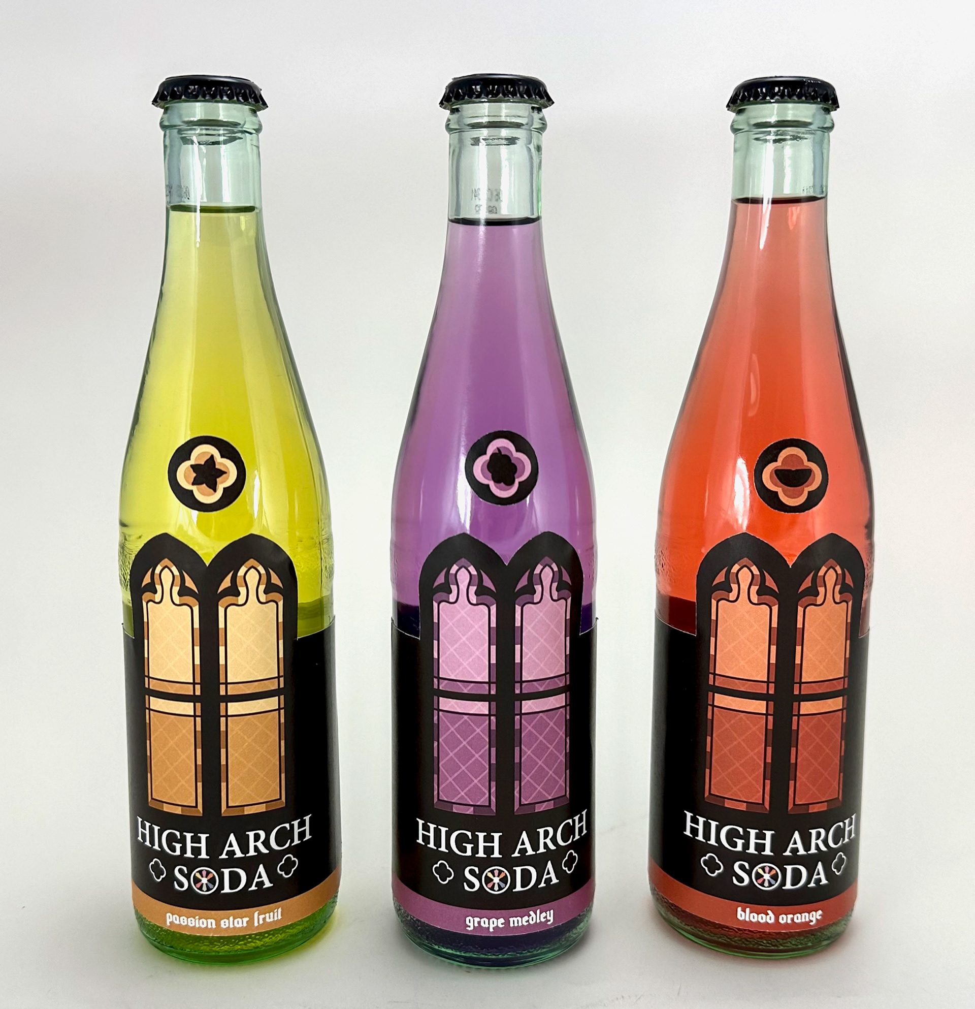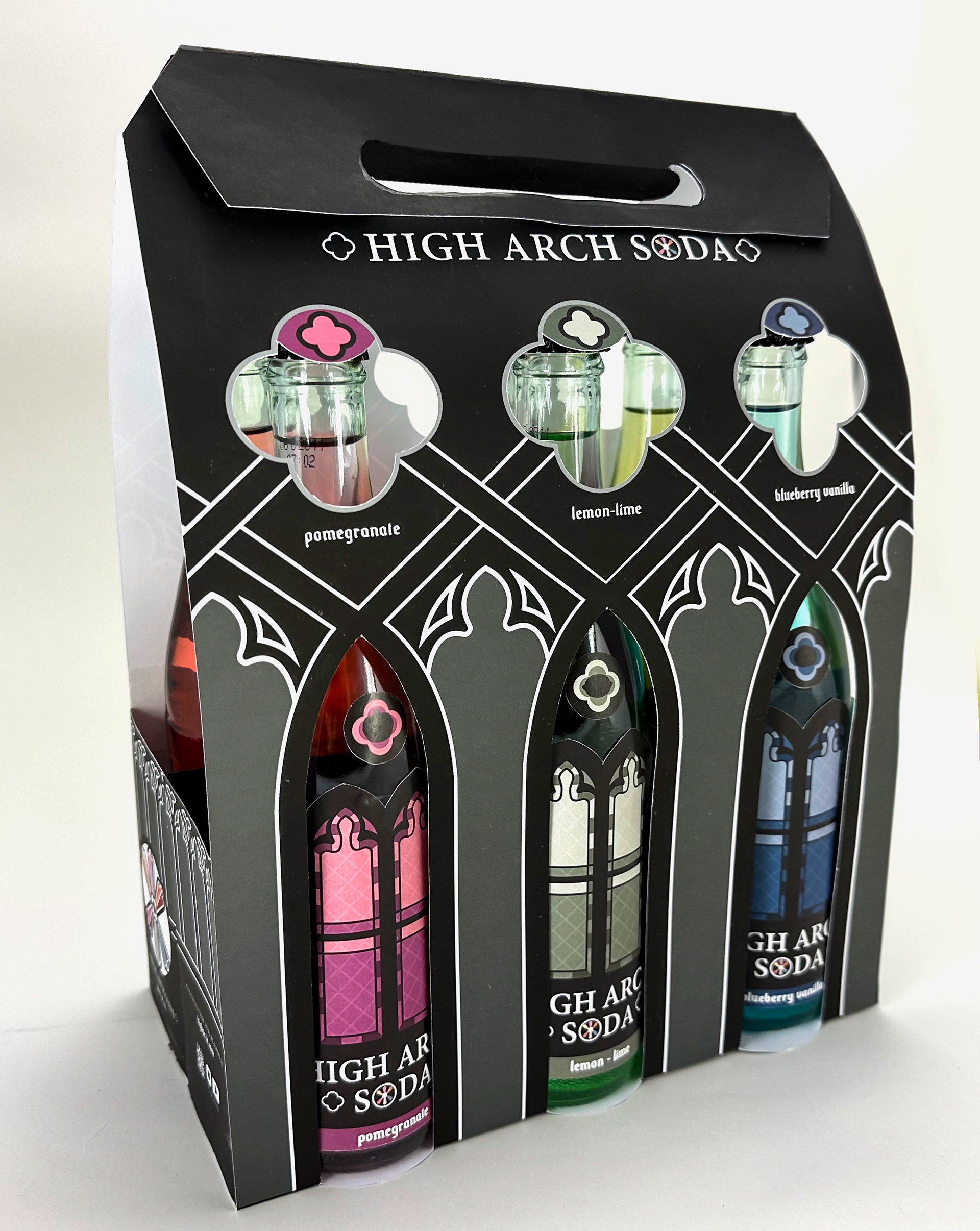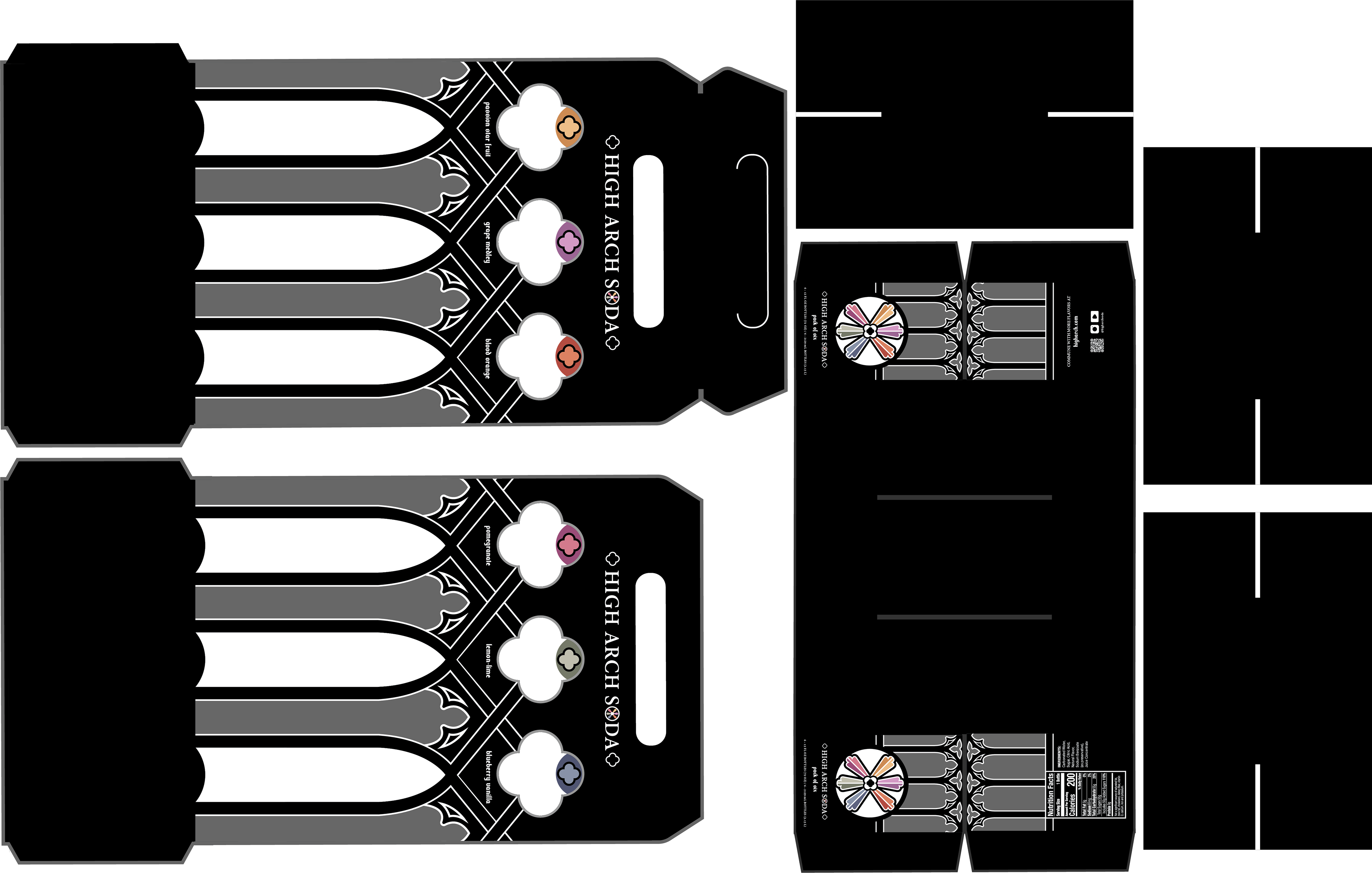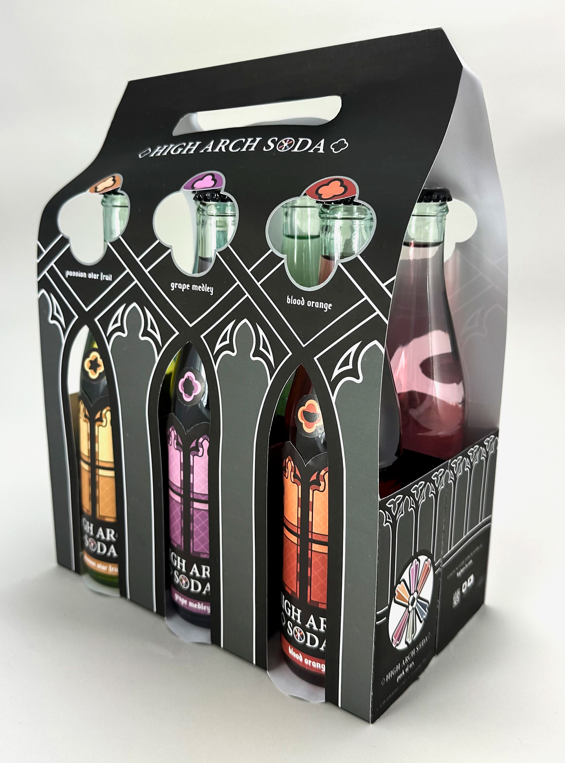 Design for a soda multi-pack inspired by stained glass windows in Gothic architecture. High Arch Soda is meant to look like a collector's soda line.