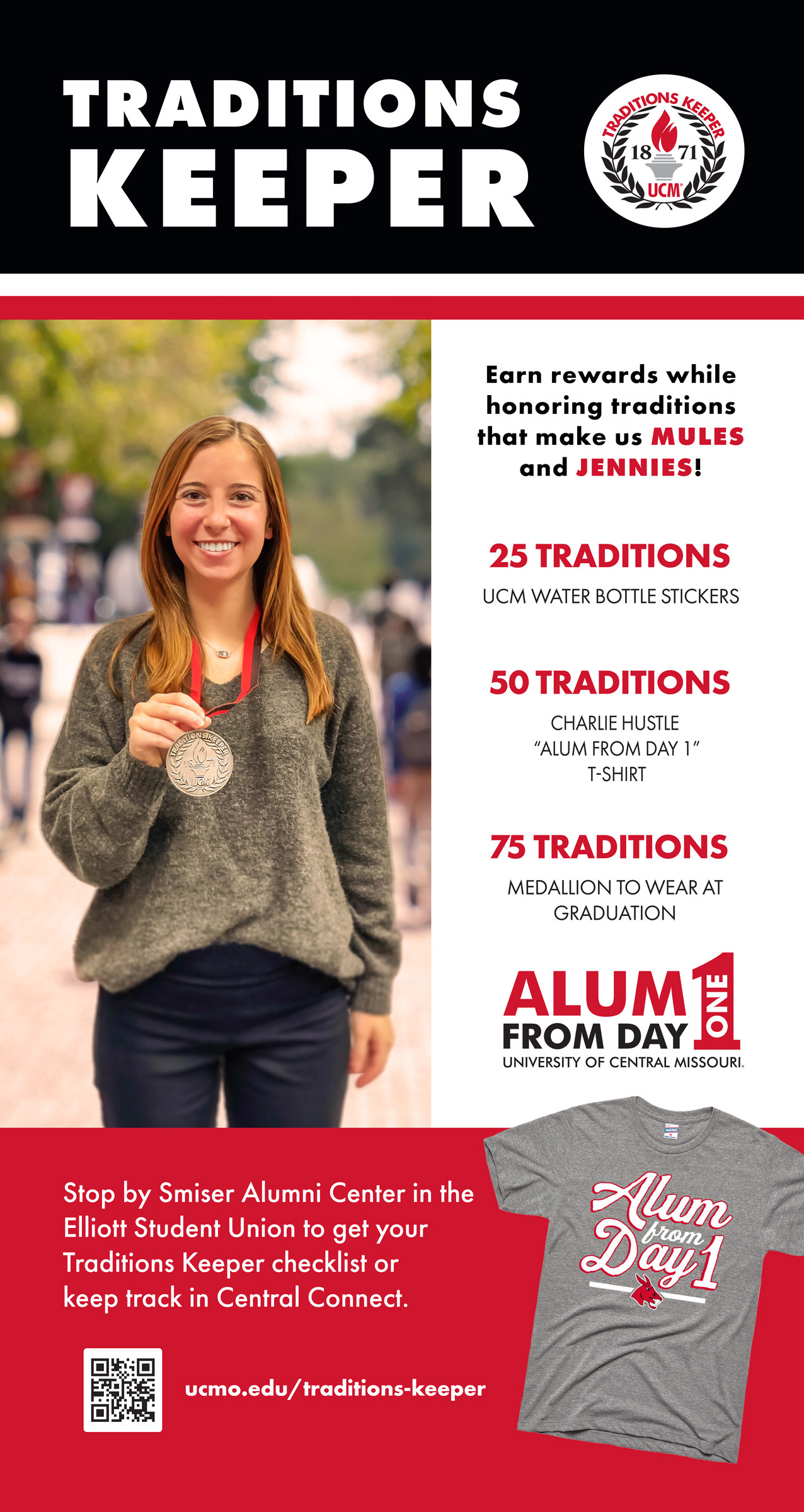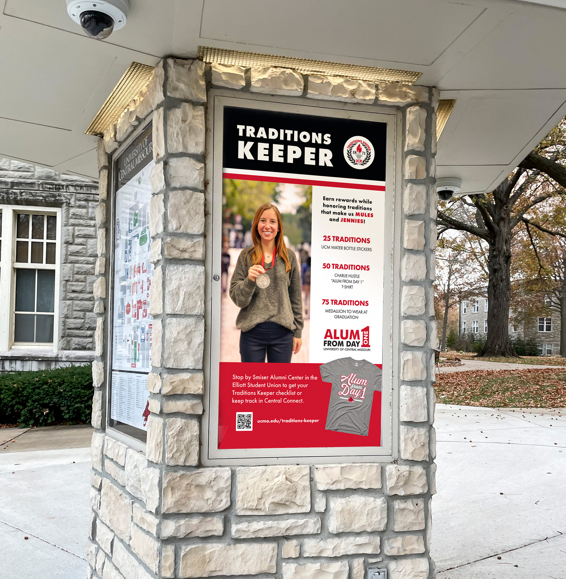 A kiosk poster promoting rewards a student gets by participating in “Traditions” established by UCM’s Alumni Foundation.